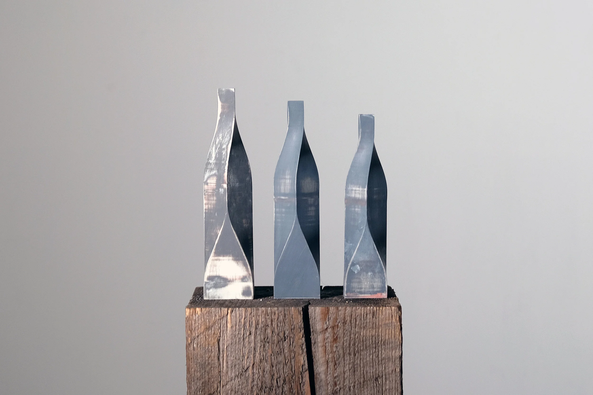 040117 Light Grows Darkness Grows, 2017, pla thermoplastic, aerosol paint + polyester resin, (left) 13 x 3.0625 x .0625 inches (center) 11.75 x 2.8125 x 2.8125 inches (Right) 11 x 2.6875 x 2.6875 inches
