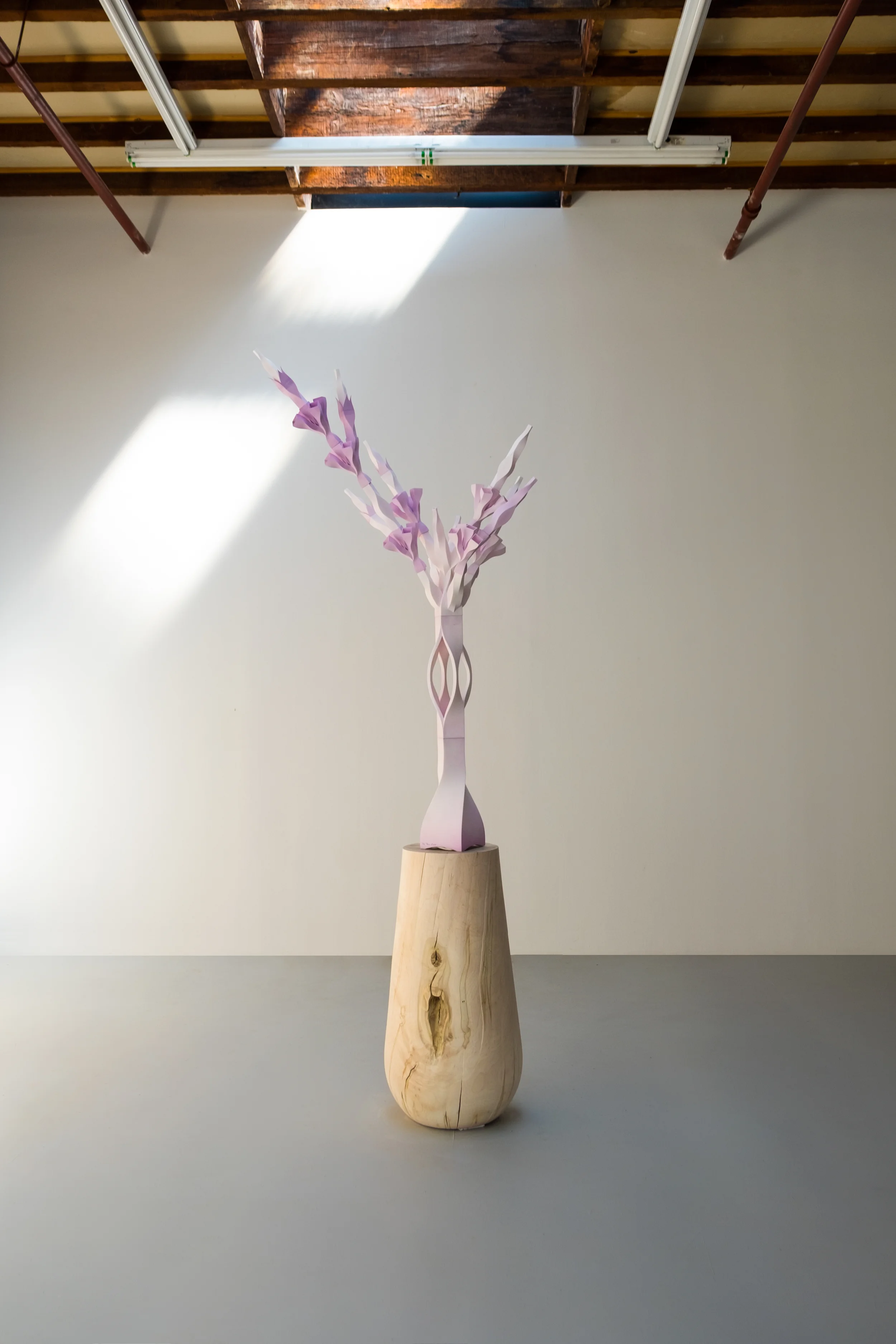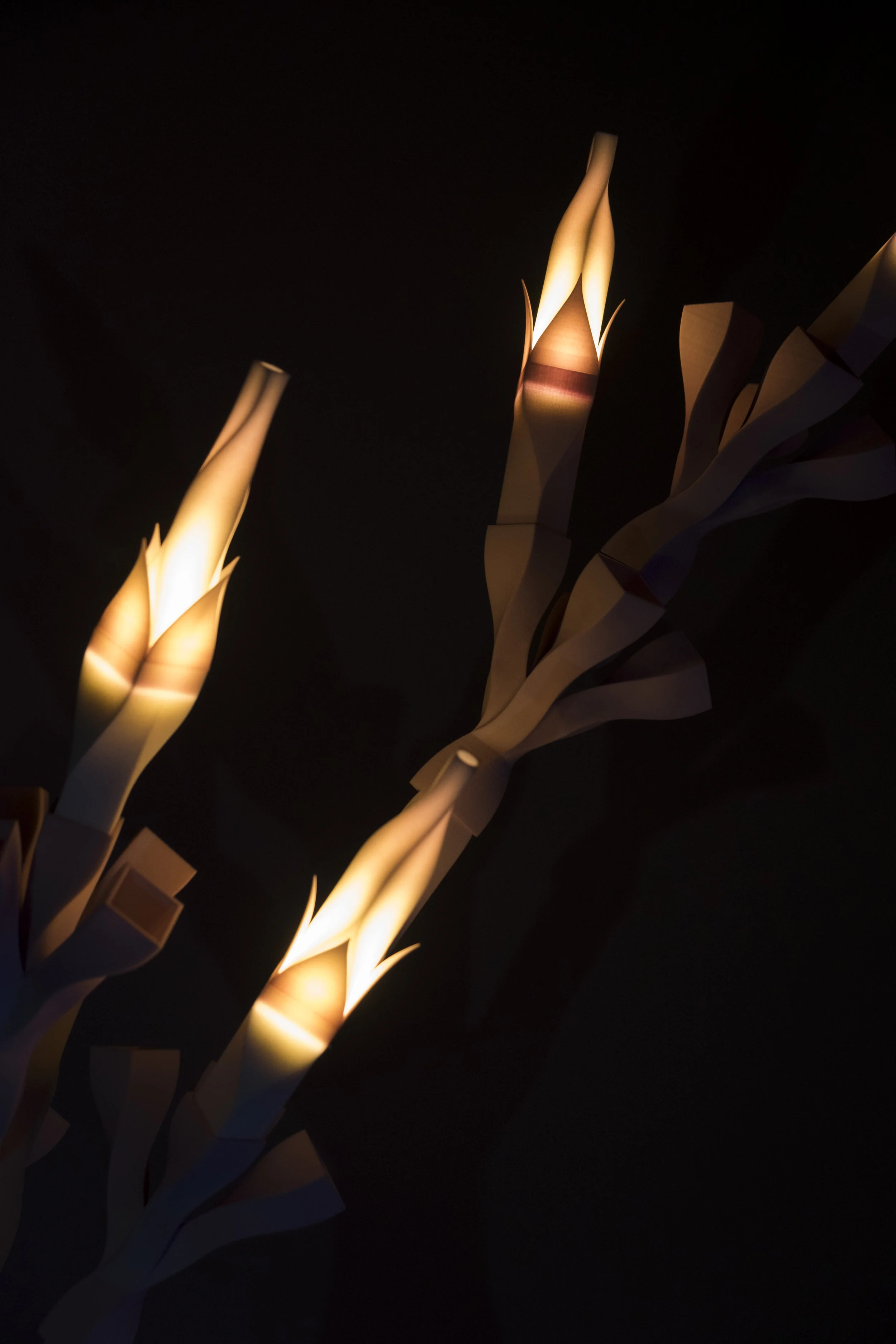 072616 And Then Tree of Life Compositional Study Eight: Wabisabi Asymmetree, 2016, Hand-dyed polyamide, maple, wire, LED lights, 84” x 34” x 19” (With Original Bleached maple pedestal)