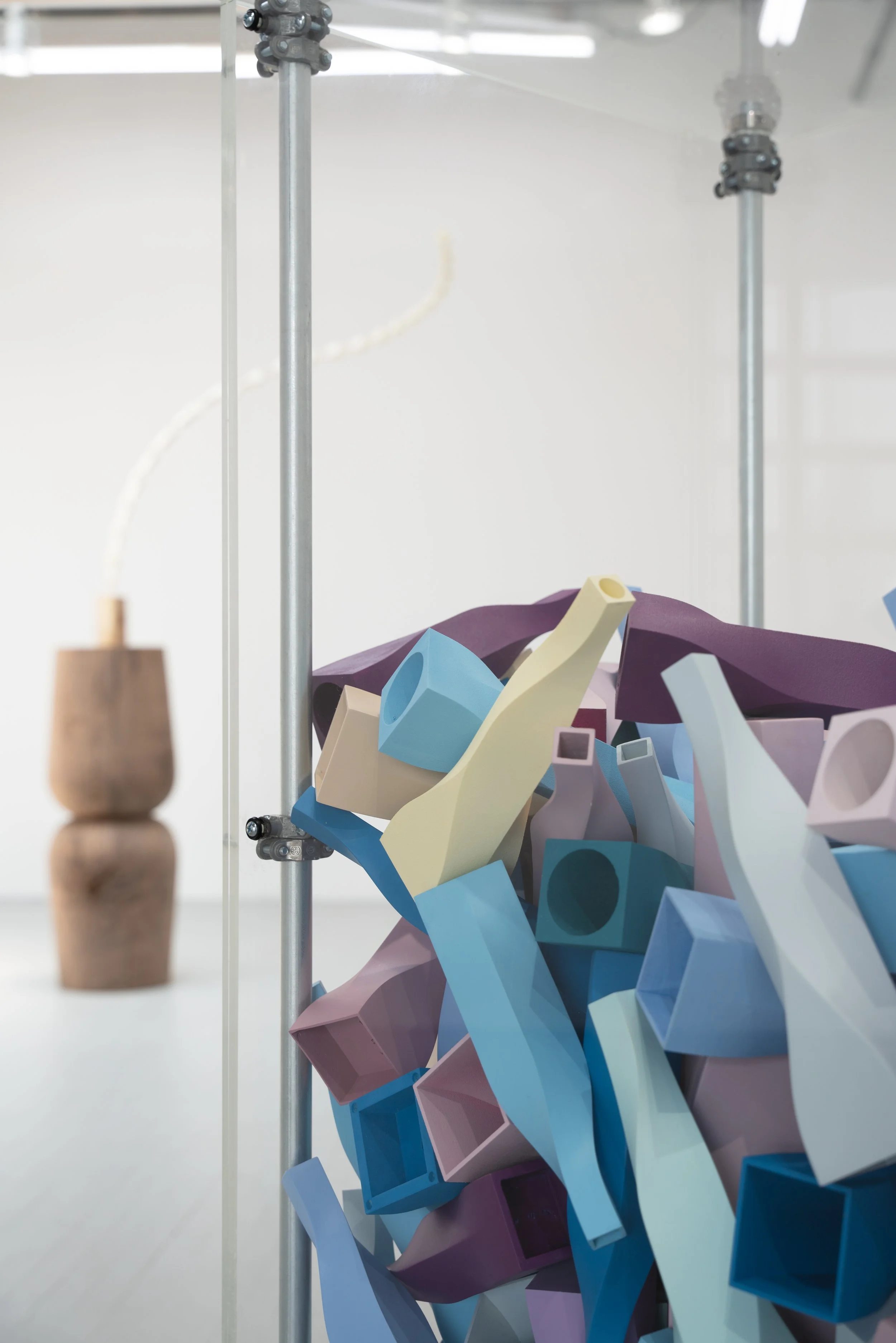 acrylic paint, polyamide, polyurethane resin, polyacrylic resin, plexiglass, aluminum pipes, metal hardware, Baltic birch plywood, casters